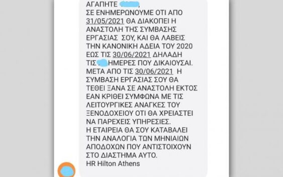 Ανακοίνωση του Συνδικάτου για τις πρακτικές της εργοδοσίας του Hilton: Με sms ανακοινώνει αναστολές πριν την κυβέρνηση!!