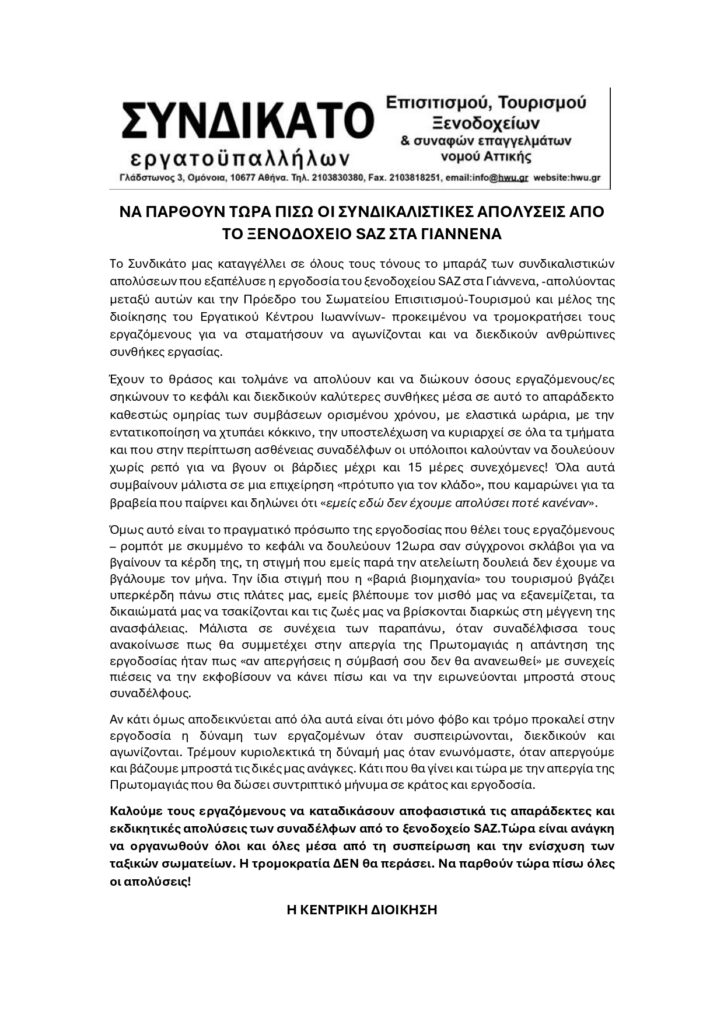 Καλούμε τους εργαζόμενους να καταδικάσουν αποφασιστικά τις απαράδεκτες και εκδικητικές απολύσεις των συναδέλφων από το ξενοδοχείο SAZ.Τώρα είναι ανάγκη να οργανωθούν όλοι και όλες μέσα από τη συσπείρωση και την ενίσχυση των ταξικών σωματείων. Η τρομοκρατία ΔΕΝ θα περάσει. Να παρθούν τώρα πίσω όλες οι απολύσεις!