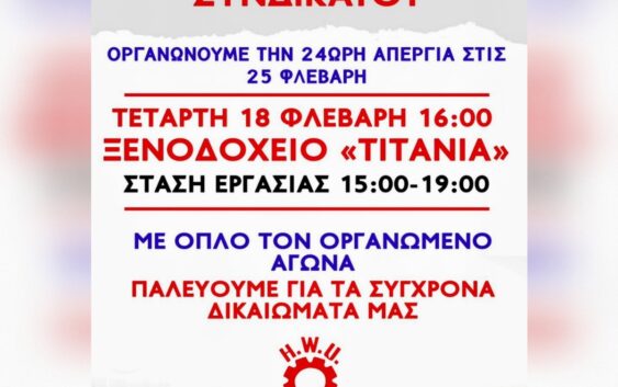 Οργανώνουμε την 24ωρη ΑΠΕΡΓΙΑ στις 25 Φλεβάρη – Γενική Συνέλευση την Τετάρτη 18/2 στις 16:00 – στο ξενοδοχείο ΤΙΤΑΝΙΑ με στάση εργασίας 15:00-19:00