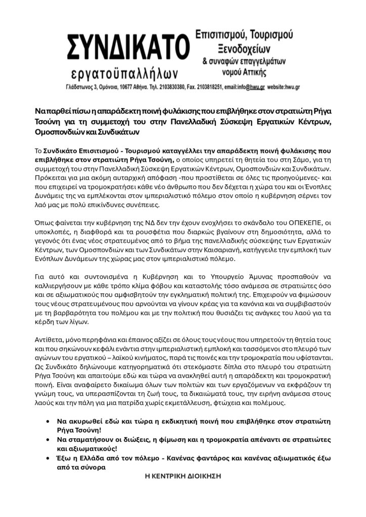 Το Συνδικάτο Επισιτισμού – Τουρισμού καταγγέλλει την απαράδεκτη ποινή φυλάκισης που επιβλήθηκε στον στρατιώτη Ρήγα Τσούνη, ο οποίος υπηρετεί τη θητεία του στη Σάμο, για τη συμμετοχή του στην Πανελλαδική Σύσκεψη Εργατικών Κέντρων, Ομοσπονδιών και Συνδικάτων.